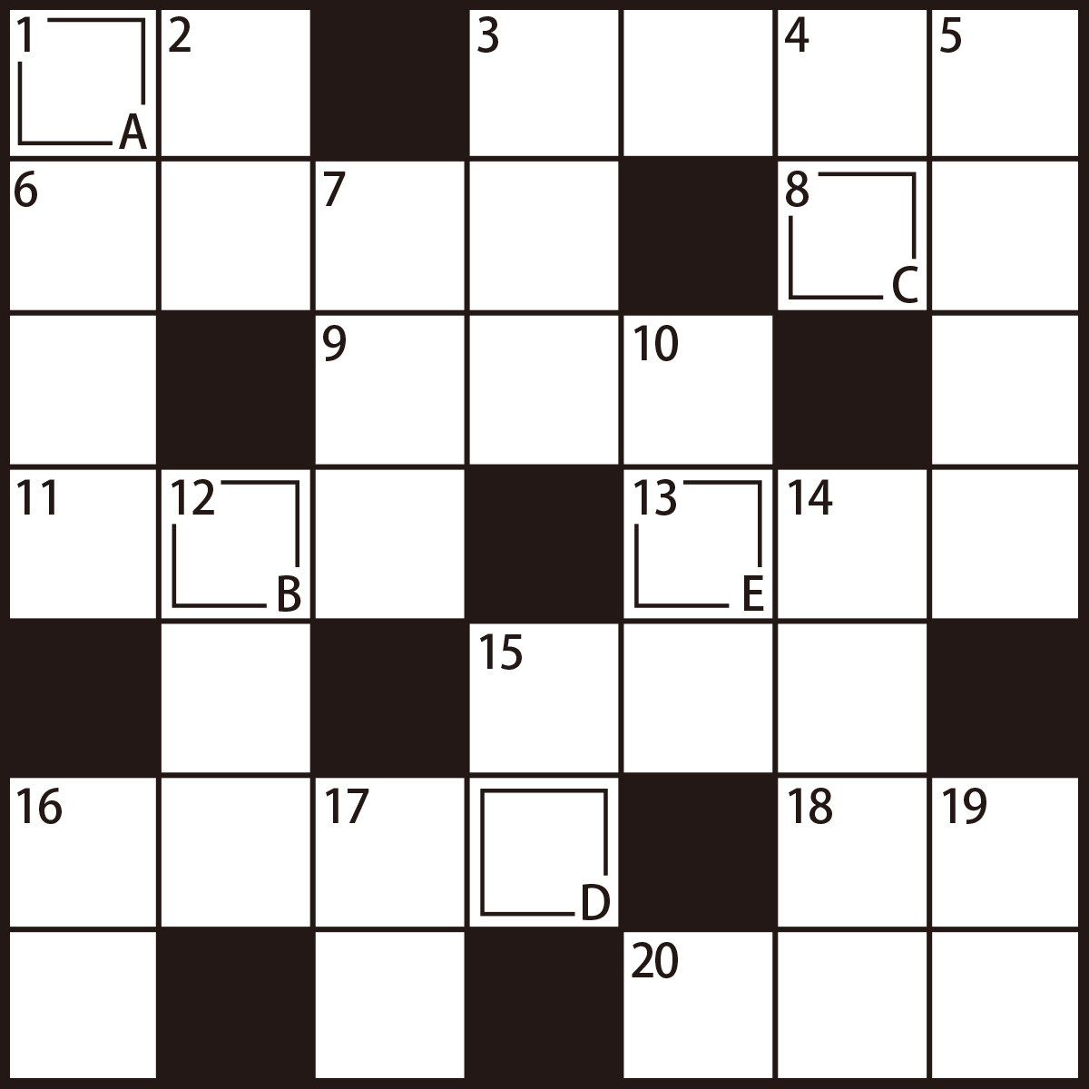 クロスワードパズル内の2重マスA〜Eに入る文字を並べてある単語を導き出しましょう。クロスワードパズルを印刷して挑戦してみましょう。