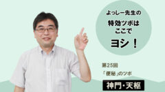 「片腕をまげて手のひらを上にしてから腕をまっすぐに下ろし、肩をあげて落とす動作を数回繰り返し、手のひらを前に向けたまま少しだけ後ろにずらして、外回しに小さく3回円を描きます。反対側の腕も同じように動かします。この小さな動きによって、“広背筋”と呼ばれる背中の筋肉がゆるむんです」