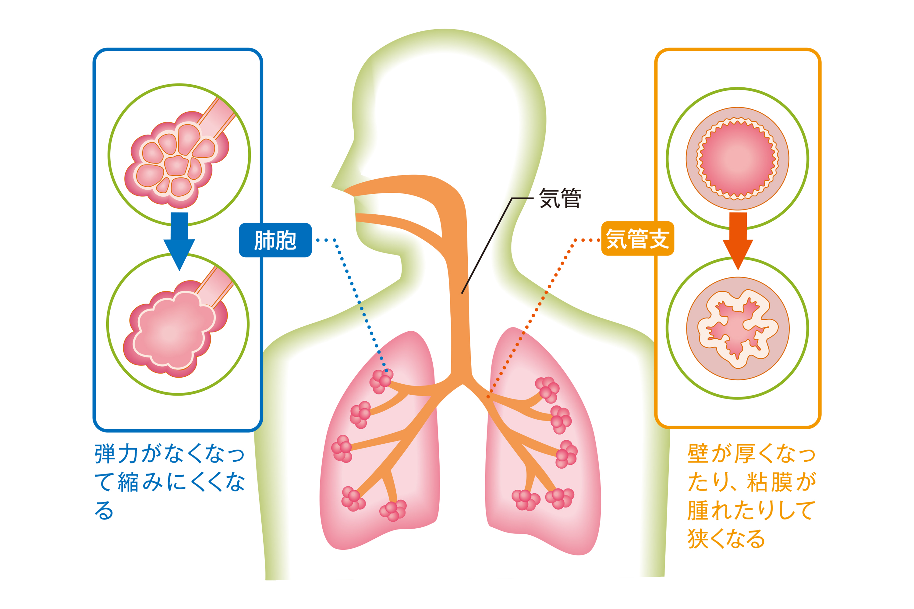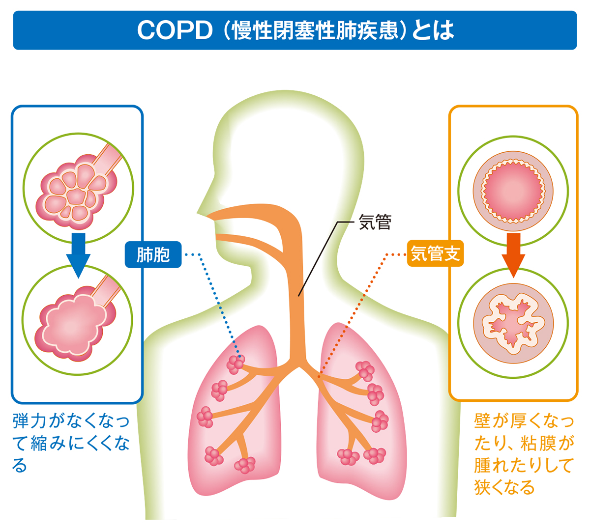細気管支の先には、酸素を取り入れて二酸化炭素を出す肺胞があります。肺胞が広い範囲で壊れた状態が肺気腫です。これに対し、気管支の壁が広い範囲で強い炎症を起こした状態が慢性気管支炎です。COPDは、これらの2つをまとめた病名です。階段を上る時や重い荷物を持って歩く時に激しい息切れが起きたり、風邪を引いていないのにいつもタンが出たりする場合は、COPDを発症しているおそれがあります。