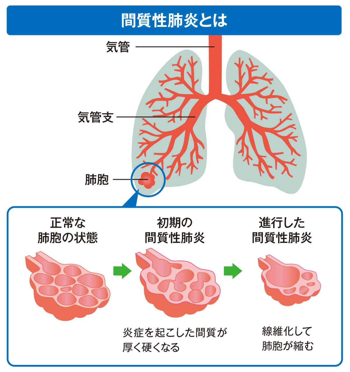 間質性肺炎は肺胞壁が線維化する難治性の肺疾患で息切れ・セキに要注意