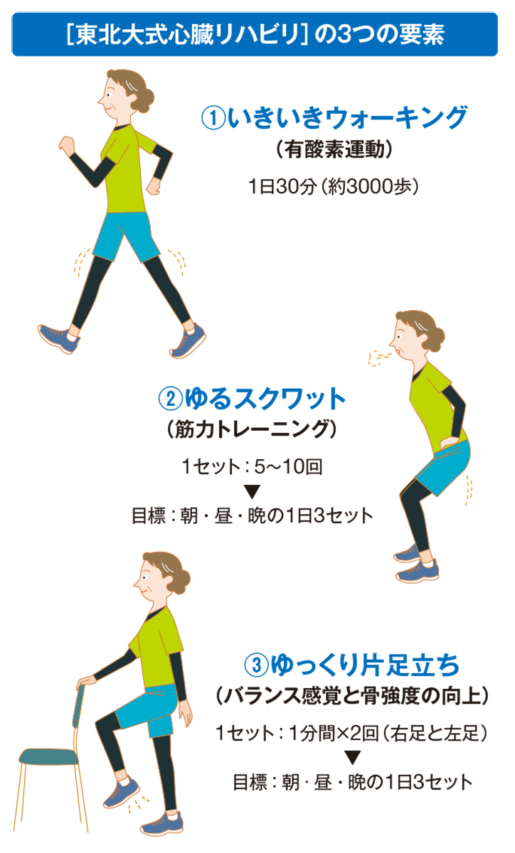 心臓リハビリを実践する際は、①いきいきウォーキング、②ゆるスクワット、③ゆっくり片足立ちの3つを習慣にするといいでしょう(イラスト参照)。